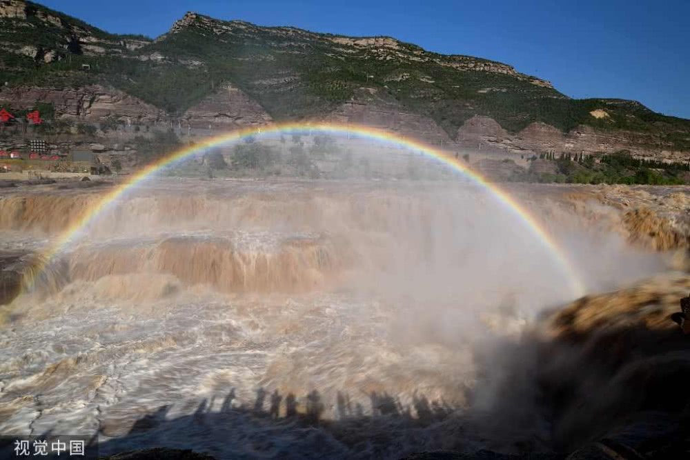 2019年8月17日,山西临汾,游客在吉县黄河壶口瀑布欣赏“彩虹门”景观。