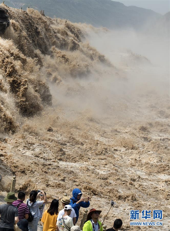 7月19日,游客在陕西境内的壶口瀑布群前留影。