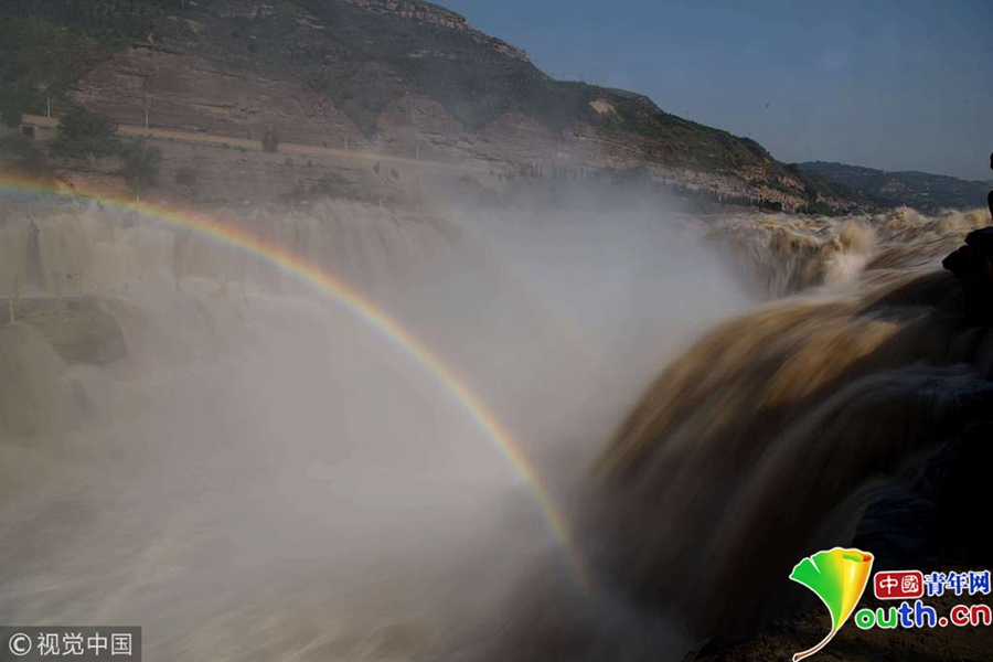 5月31日,山西临汾奔腾咆哮的黄河壶口瀑布吸引游客。