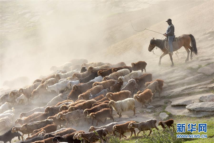 6月6日,新疆阿勒泰地区福海县牧民赶着牲畜向夏季牧场迁徙新华社记者 丁磊 摄