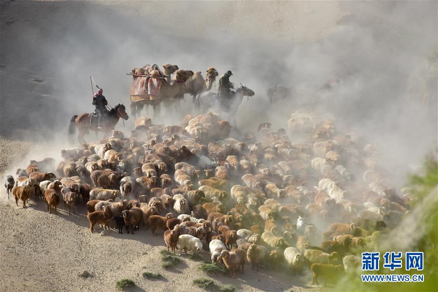 6月6日,新疆阿勒泰地区福海县牧民赶着牲畜向夏季牧场迁徙。 新华社记者 丁磊 摄