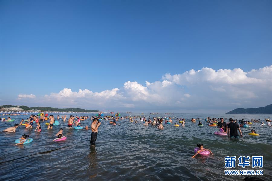 8月22日,游客在朱家尖南沙景区游玩。 新华社记者 王海燕 摄