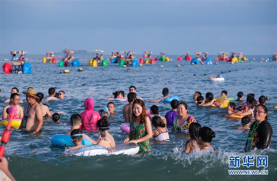 8月22日,游客在朱家尖南沙景区嬉戏游玩。 新华社记者 徐昱 摄