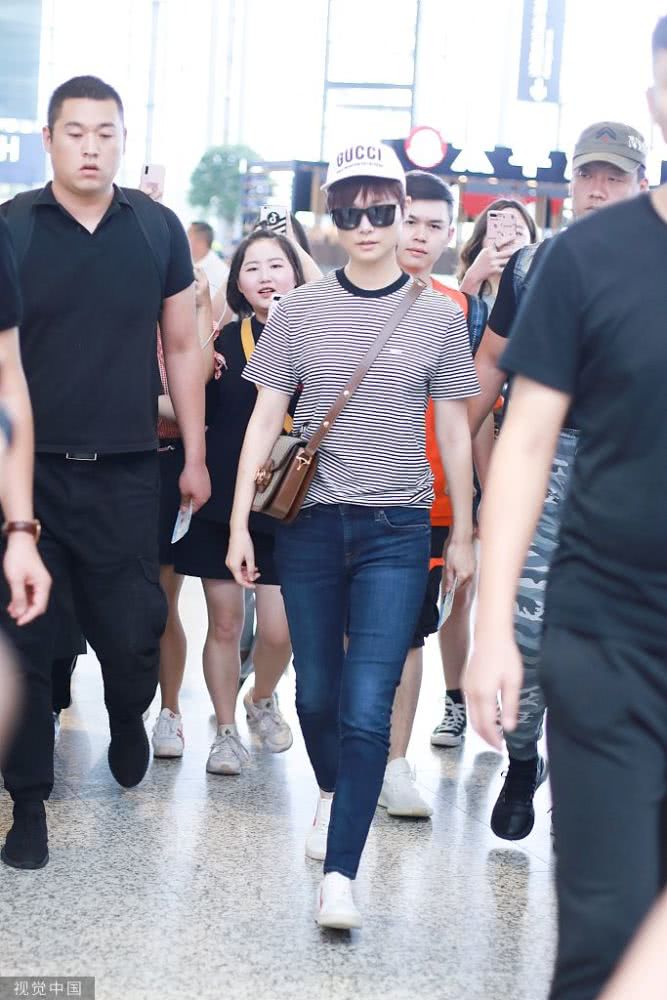 李宇春条纹装扮现身机场,青春活力,人气爆棚