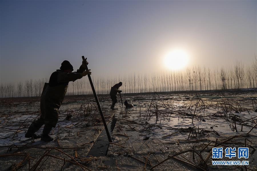 2月1日,在雄安新区安新县东向阳村的一处藕塘,挖藕工将塘面结的冰用电锯切成小块后挪开。新华社记者沈伯韩摄