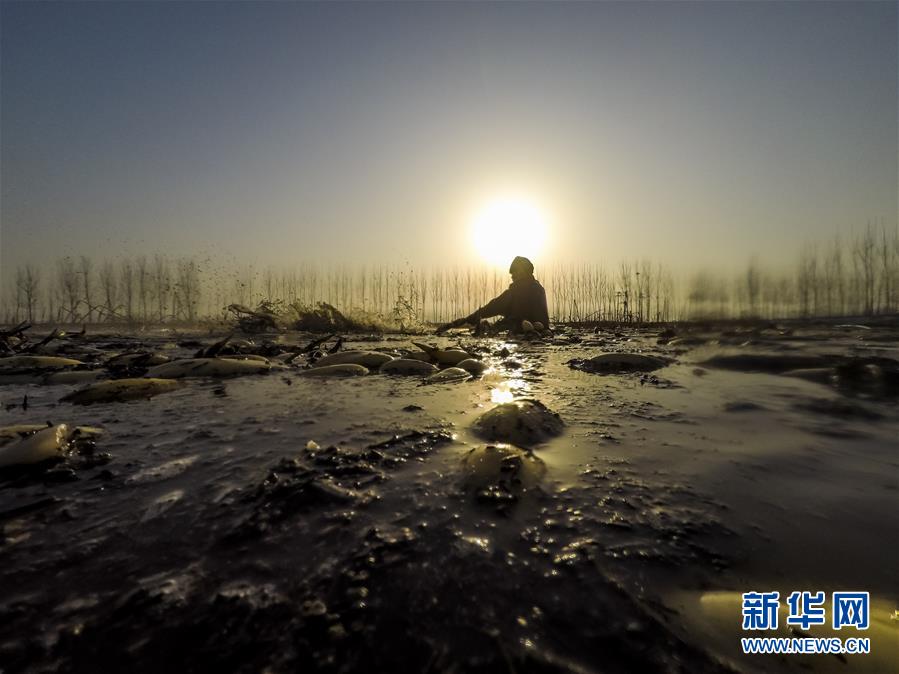 2月1日,在雄安新区安新县东向阳村的一处藕塘,一名挖藕工在水里工作。新华社记者沈伯韩摄