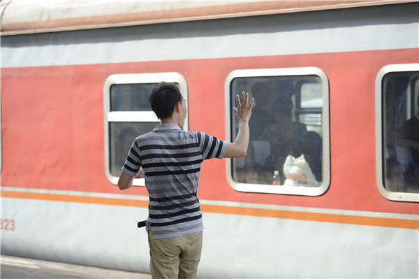 2014年08月27日,广东省东莞市,开学季即将到来时,许多暑假来东莞和父母团聚的小朋友又的踏上回家的列车了。在东莞东火车站,一位父亲在向小孩告别。