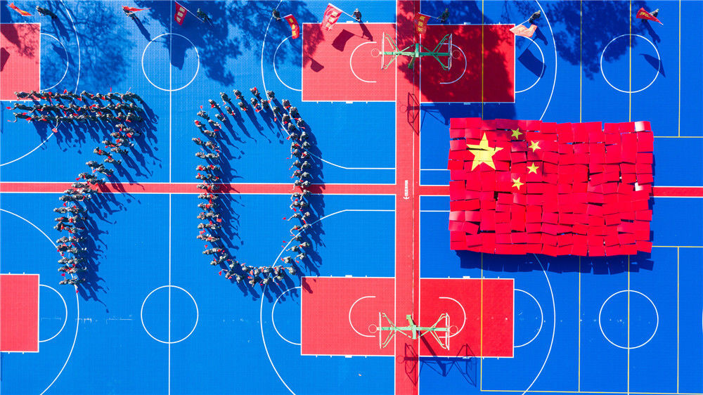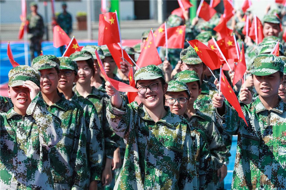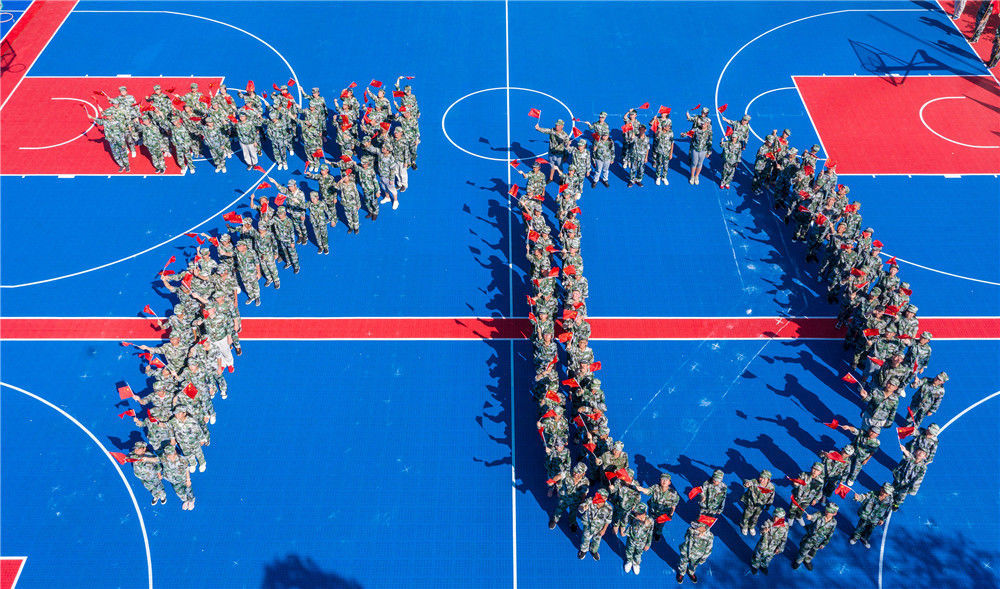 2019年8月26日,浙江湖州,德清县第四中学新生军训期间开展“不忘初心 牢记使命”主题教育活动。近五百名中学生通过拼凑数字“70”、国旗等图案,表达对祖国的热爱,向新中国成立70周年献礼。