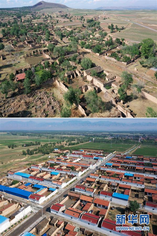 拼版照片:上图为东坪村旧村村貌;下图为东坪村新村村貌(6月13日无人机拍摄)。