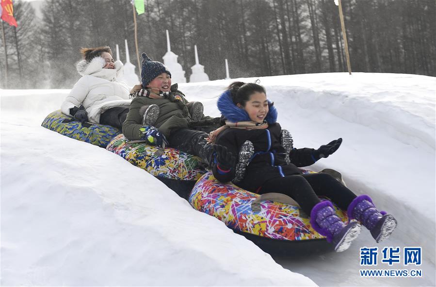 游客在二合雪乡雪圈公园内体验滑雪圈(1月23日摄)。 新华社记者许畅摄