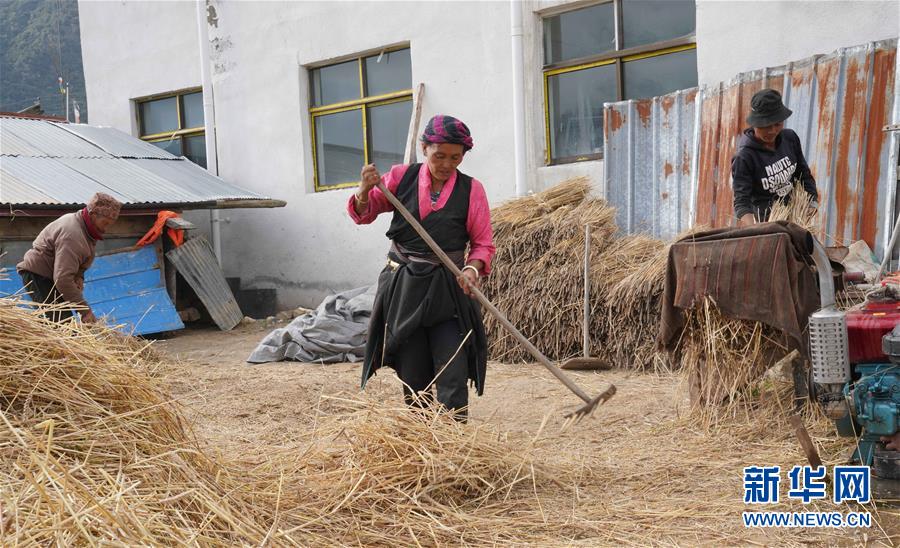乃村村民抓紧好天气打场收粮(8月26日摄)。 新华社记者 多吉占堆 摄