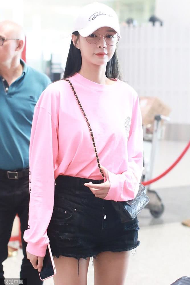 她戴着棒球帽身穿粉色卫衣搭配热裤,长腿纤细又白嫩。