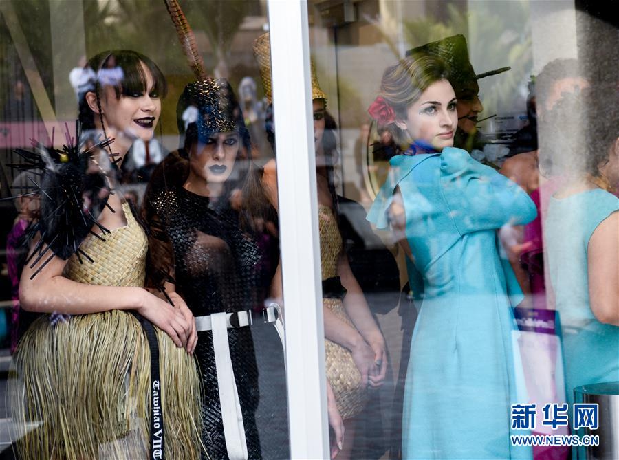8月29日,在新西兰奥克兰市中心,街头时装秀的模特在玻璃门后等待出场。新华社记者 郭磊 摄