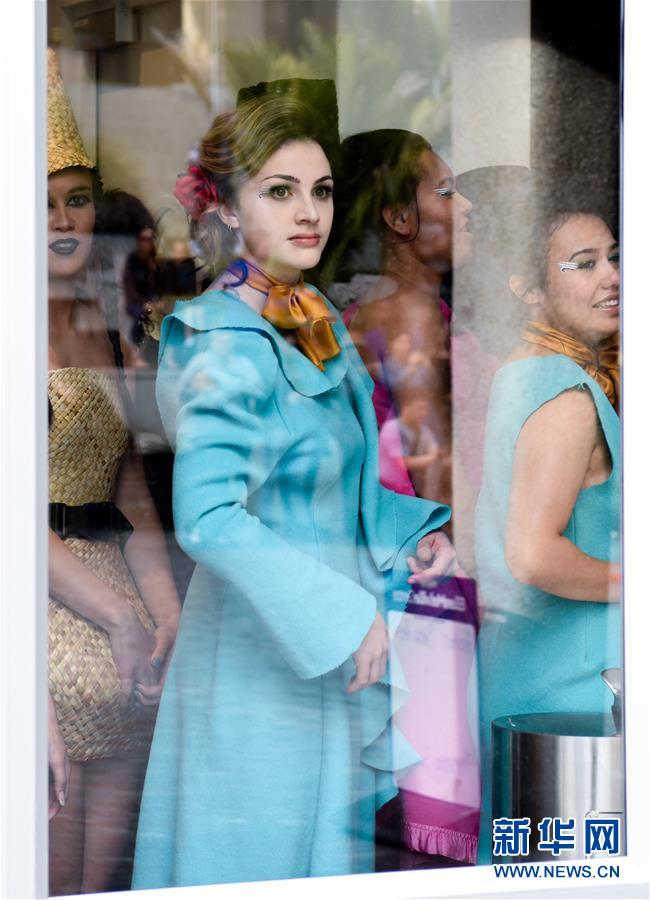 8月29日,在新西兰奥克兰市中心,街头时装秀的模特在玻璃门后等待出场。新华社记者 郭磊 摄