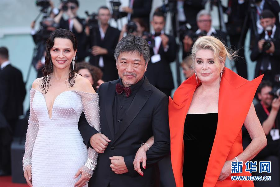 8月28日,在意大利威尼斯,开幕影片《真相》导演是枝裕和(中)携主演朱丽叶·比诺什(左)与凯瑟琳·德纳芙亮相开幕式红毯。新华社记者 程婷婷 摄