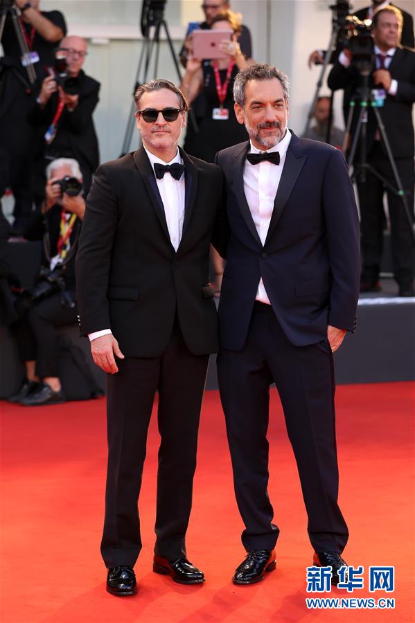 8月31日,在意大利威尼斯,威尼斯电影节主竞赛单元影片《小丑》导演托德·菲利普斯(右)与演员杰昆·菲尼克斯亮相首映红毯。