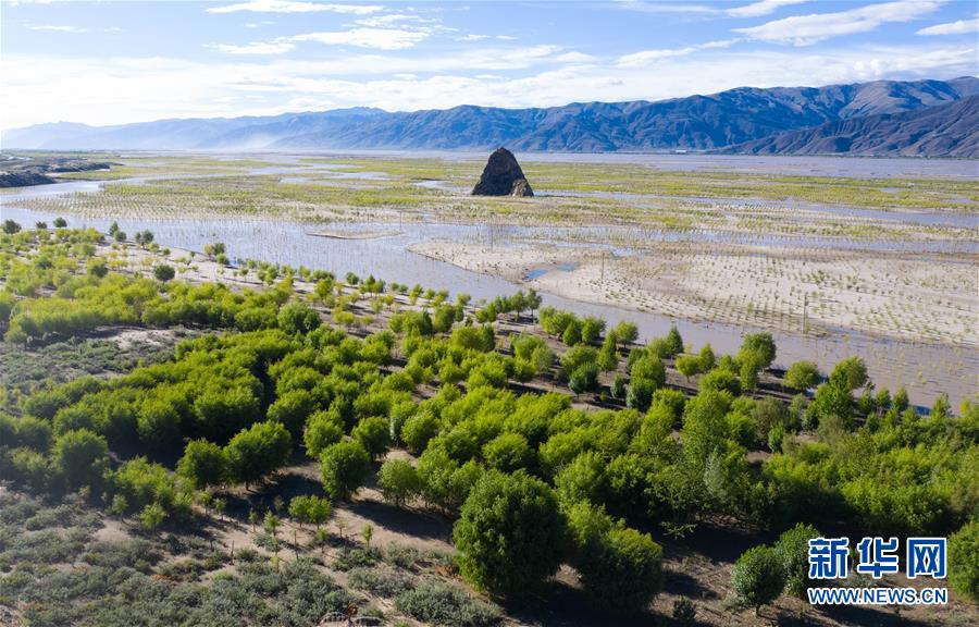 西藏雅鲁藏布江两岸栽植的树木(7月16日无人机拍摄)。新华社记者 普布扎西 摄