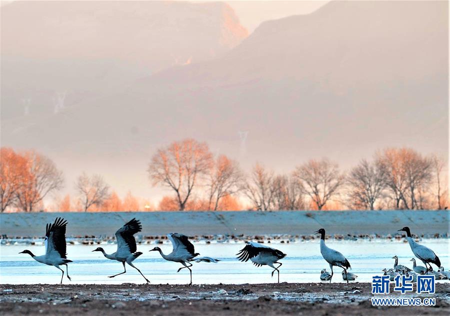 西藏拉萨市林周县境内的黑颈鹤(2017年1月16日摄)。新华社记者 张汝锋 摄