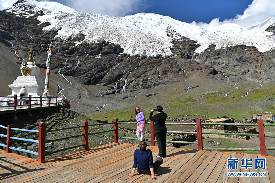 8月31日,游客在卡若拉冰川景区拍照。 新华社记者 李鑫 摄
