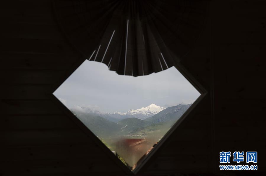 透过阿尼玛卿雪山附近一个农家乐的窗户遥望阿尼玛卿雪山(7月10日摄)。 新华社记者 费茂华 摄