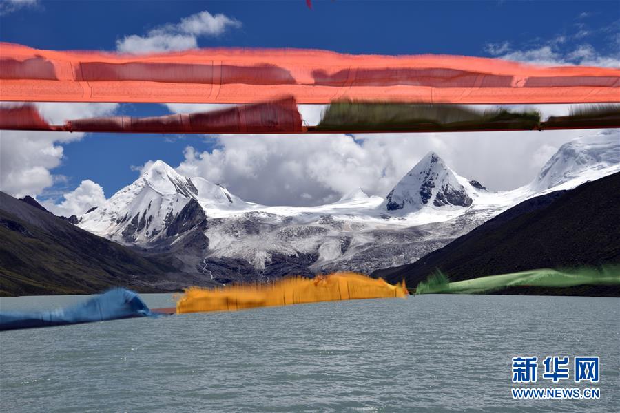 这是萨普雪山与湖泊边随风飘动的经幡(8月24日摄)。 新华社记者 黄豁 摄