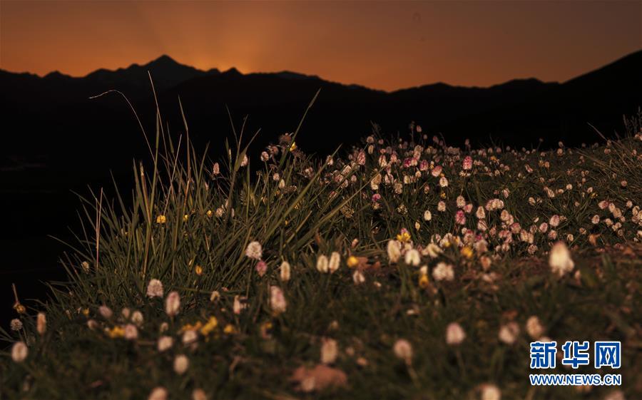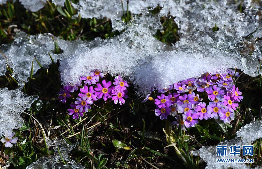在年保玉则,野花上的冰雪渐渐消融(5月21日摄)。 新华社记者 张宏祥 摄