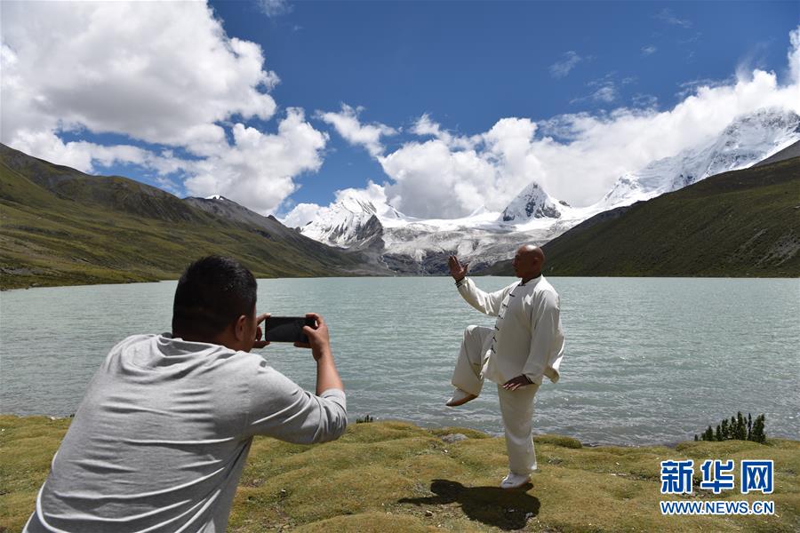 一名太极拳爱好者在萨普雪山附近留影(8月24日摄)。 新华社记者 黄豁 摄