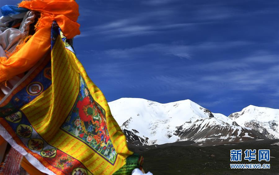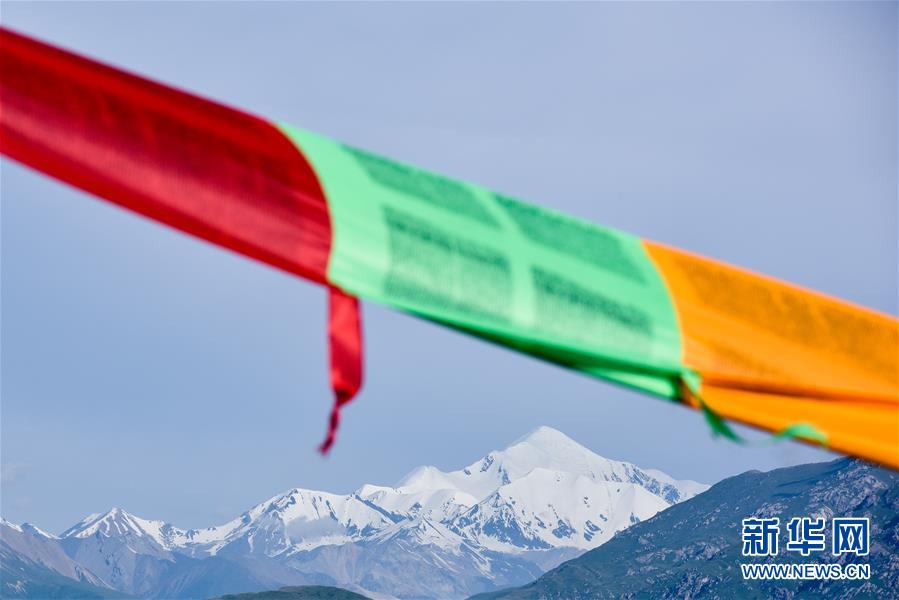 7月10日,阿尼玛卿雪山山下挂着经幡。 新华社记者 张宏祥 摄