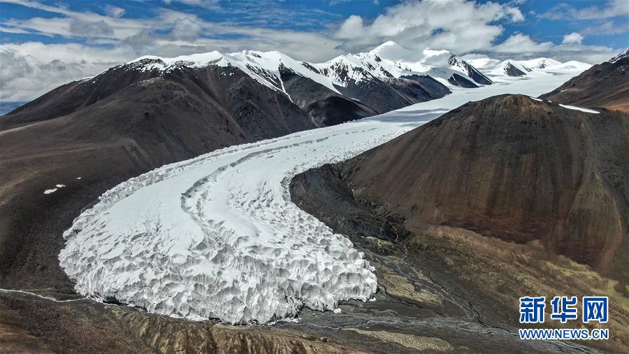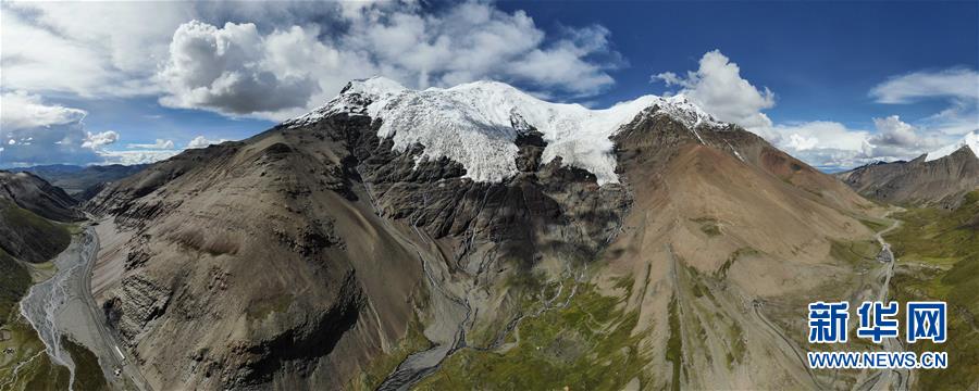 卡若拉冰川全景(8月31日无人机拍摄)。 卡若拉冰川位于西藏山南市浪卡子县和日喀则市江孜县交界处。巨大的冰川从山顶云端一直延伸到离307省道只有几百米的地方。 新华社记者 晋美多吉 摄