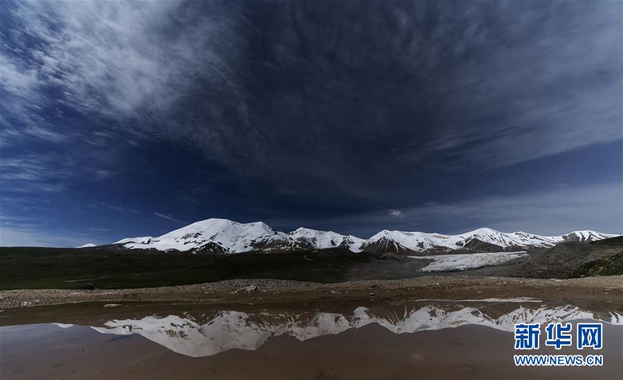 7月10日,阿尼玛卿雪山与水面相映成画。 新华社记者 费茂华 摄