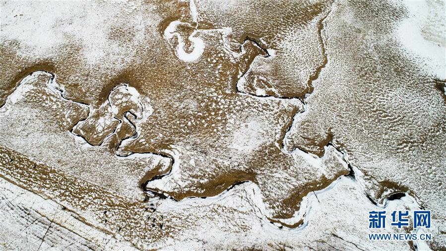 在青海省海北藏族自治州西海镇,牛羊在雪后的金银滩草原上觅食(1月17日无人机拍摄)。新华社记者吴刚摄