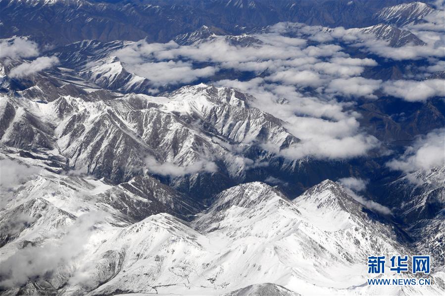 空中俯瞰祁连山腹地,白雪皑皑、云雾缭绕,尤为壮美(2018年9月19日摄)。新华社记者 范培珅 摄