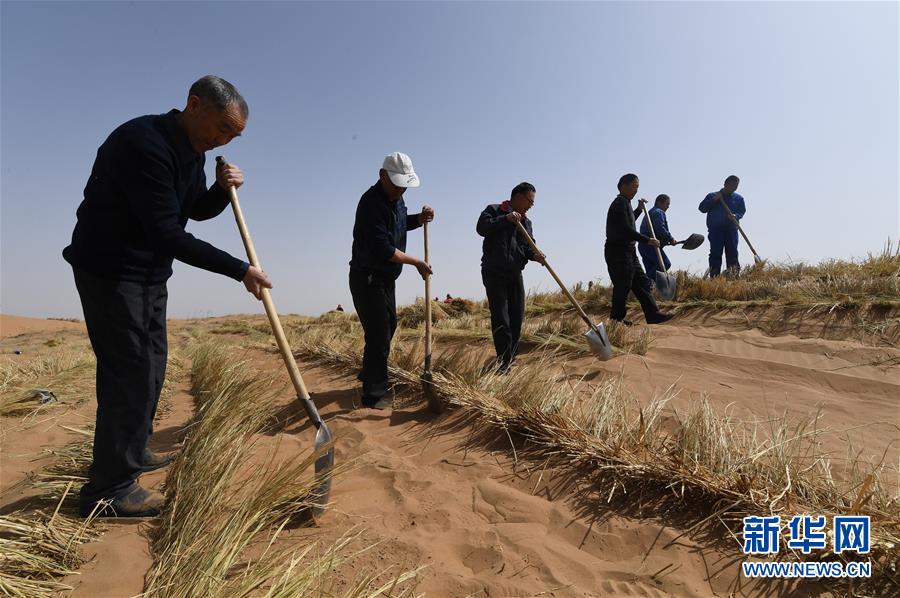 在甘肃省古浪县境内的黑岗沙风沙口,八步沙第二代治沙人用稻草压沙(3月26日摄)。新华社记者 范培珅 摄