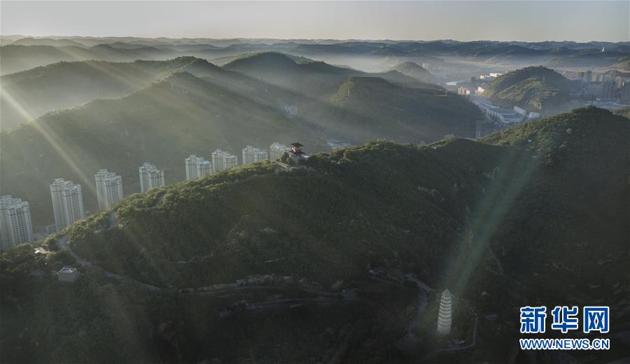 8月29日航拍的被绿色环绕的延安市宝塔山。