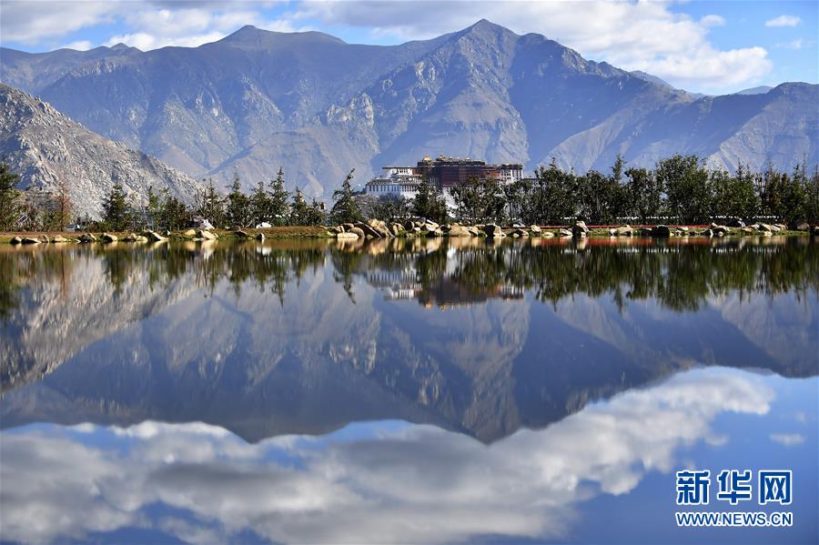 蓝天白云和绿水之间的西藏布达拉宫(6月5日摄)。 新华社记者 觉果 摄
