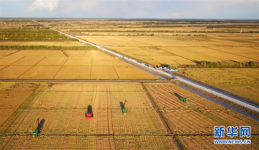 大型农机在黑龙江省三江平原一处稻田收割水稻(2017年9月28日无人机拍摄)。 新华社记者 王建威 摄