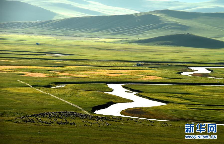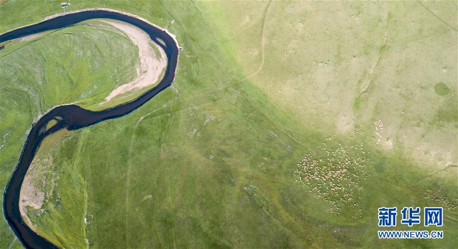8月29日无人机拍摄的内蒙古呼伦贝尔市陈巴尔虎旗境内的莫日格勒河与羊群。 新华社记者李京摄