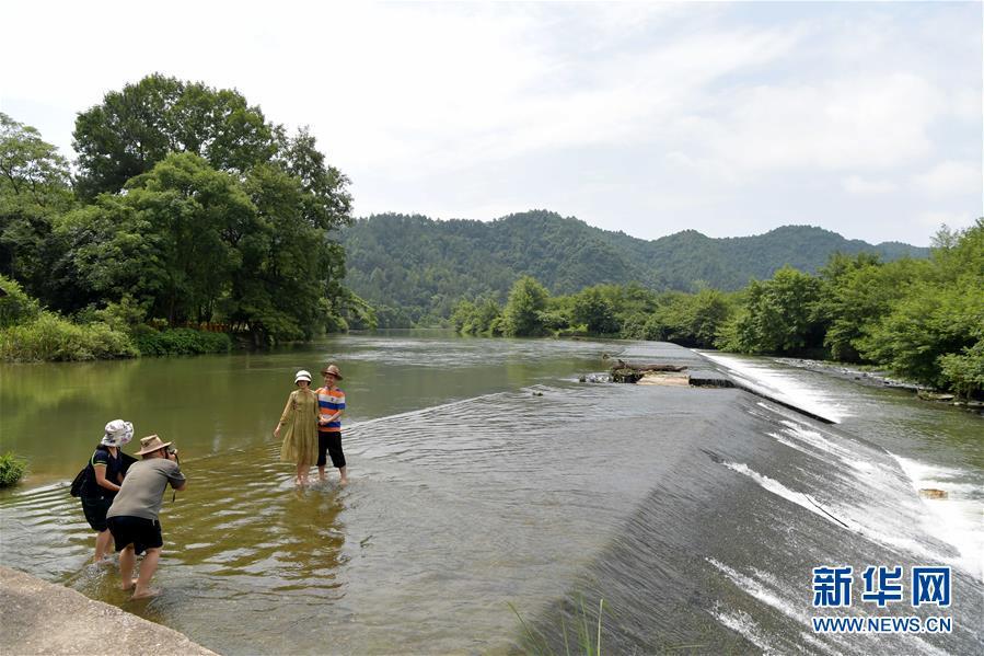 5月29日,游客在槎滩陂水利灌溉工程游玩。新华社记者彭昭之摄