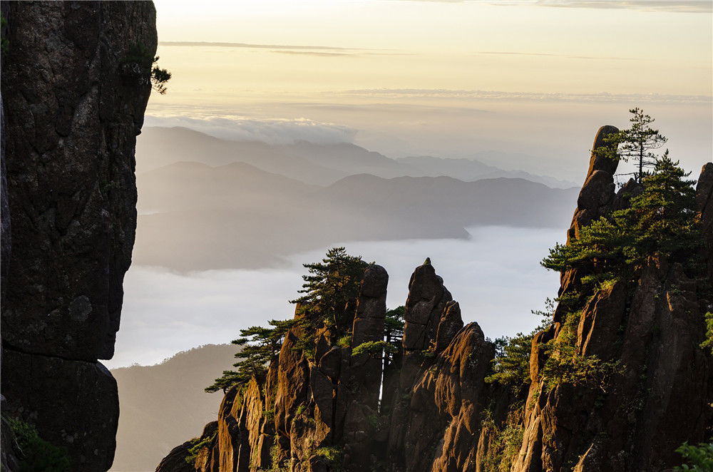 2019年9月5日早上,安徽黄山风景区现壮丽的日出云海景观。静态的峰林、巧石和苍松,与动态的云海、日出和溪水同框竞秀,美如画卷。光明顶上,中外游客争相举起相机,记录这一壮丽奇观。方立华/千龙图像/视觉中国
