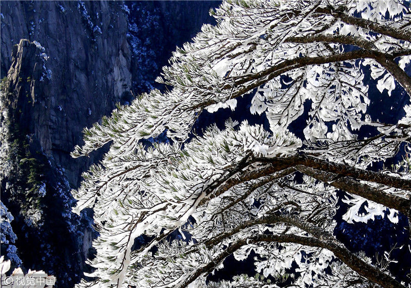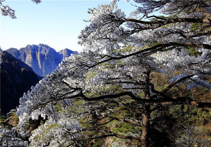 2019年3月4日,雨后的安徽黄山风景区气温骤降至零度以下,出现了春日罕见的雾凇美景,漫山遍野,银装素裹,玉树琼枝。
