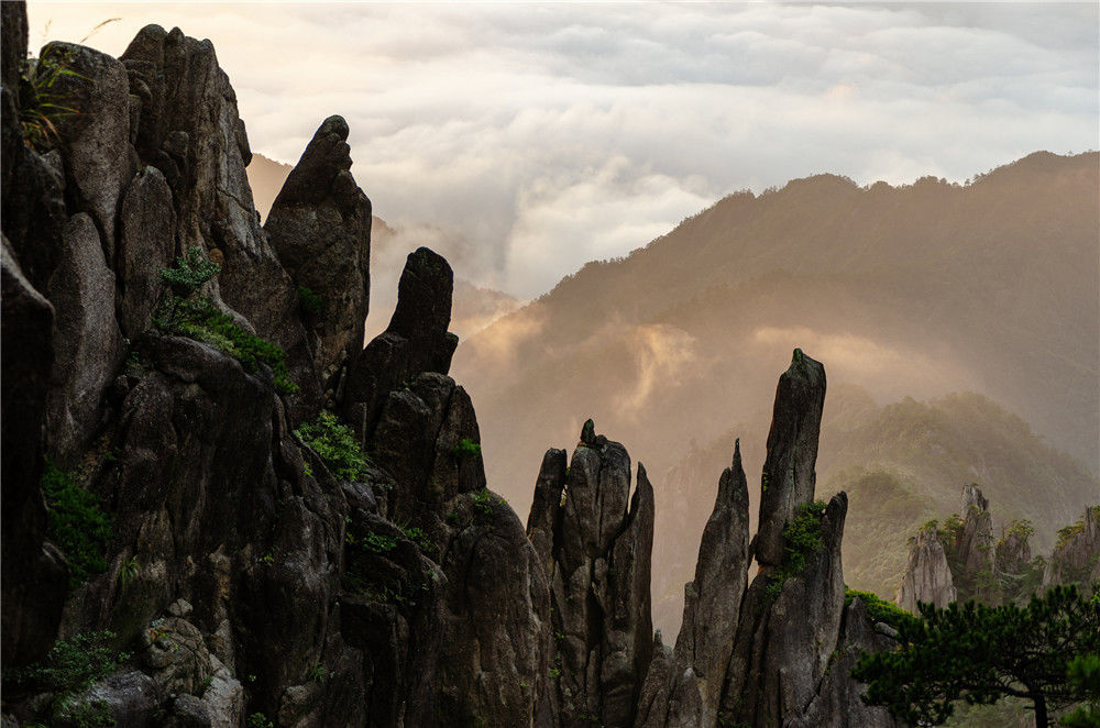 2019年9月5日早上,安徽黄山风景区,静态的峰林、巧石和苍松,与动态的云海、日出和溪水同框竞秀,美如画卷