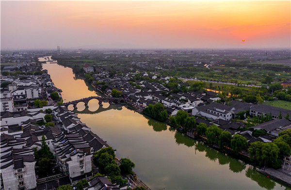 2019年5月2日,浙江杭州,晚霞映照大运河余杭段。