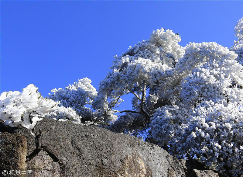 2019年3月4日,雨后的安徽黄山风景区气温骤降至零度以下,出现了春日罕见的雾凇美景,漫山遍野,银装素裹,玉树琼枝。