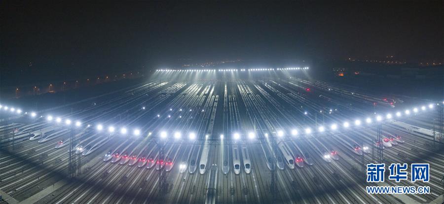 1月20日,动车组列车停靠在武汉动车段的存车线上,准备进行检修和保温作业(无人机拍摄,拼接照片)。 新华社记者熊琦摄