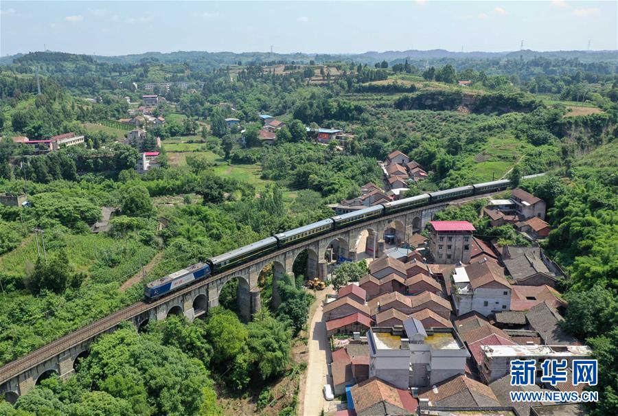 成渝铁路王二溪大桥采用了中国传统的石拱桥建造技术,成为国内少有的铁路石拱桥(6月13日无人机拍摄)。 新华社记者薛玉斌摄