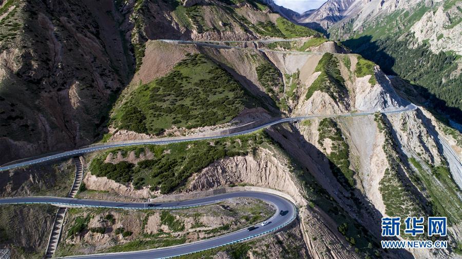 连续转弯的独库公路盘山道(2017年7月15日无人机拍摄)。 新华社记者 江文耀 摄