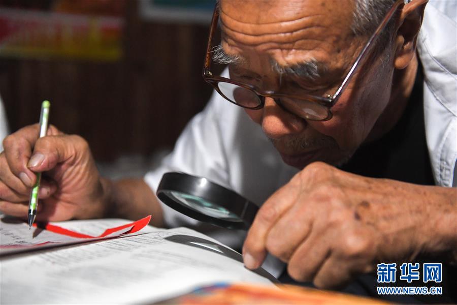9月7日,唐上君在“书楼”里用放大镜查看习题。新华社记者 陈泽国 摄