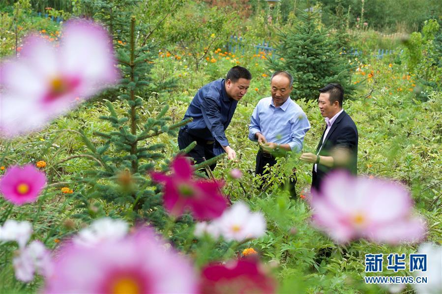 在宁夏固原市西吉县吉强镇龙王坝村,固原市农业学校林业高级讲师邓志力(中)在指导村民进行油用牡丹种植(8月30日摄)。