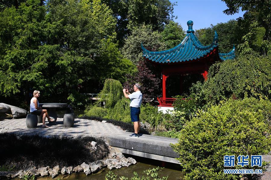 8月24日,在比利时布吕热莱特市,游客在天堂动物园的“中国园”拍照留念。新华社记者 郑焕松 摄