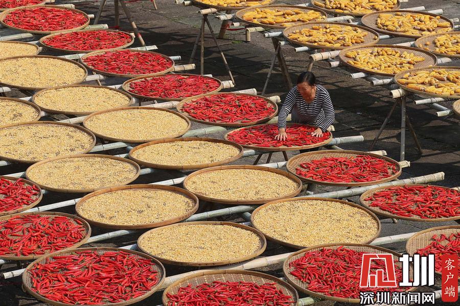 秋天,是收获的季节。安徽省黄山市呈坎古村村民将收获归仓的玉米、黄豆、红辣椒等农作物果实因地制宜晾晒,在古村晒场上描绘出一幅丰收晒秋图。